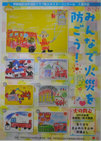 甲府地区消防本部では、幼年期における正しい火の取扱いと幼年消防クラブ員としての認識を深め、幼児の火遊びによる火災の根絶を図るとともに、火災予防及び防火思想の普及啓発を目的に防火ポスターコンクールを開催しました。