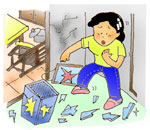 ◆ まず、家族の安全の確認。 ◆ 外へ逃げるときはあわてず、落ち着いて。 ◆ 非常持ち出し品を用意する。 ◆ ガラスの破片などから足を守るために必ず靴を履く。 |