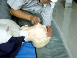 ●片手を額に当て、もう一方の手の人差し指と中指の2本をあご先に当て、これを持ち上げ、気道を確保する。 ![]() |