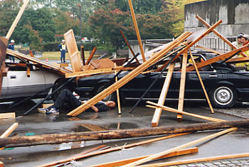 平成15年10月27日・28日に緊急消防援助隊関東ブロック合同訓練が、山梨県甲府市「小瀬スポーツ公園」において行われました。 関東ブロック1都9県(東京都、茨城県、栃木県、群馬県、埼玉県、千葉県、神奈川県、長野県、静岡県、山梨県)から80消防本部、9航空隊、678名の隊員が参加し、1日目の27日は参集訓練・野営訓練・消防庁長官による巡視激励等が行われました。 2日目の28日は、航空隊による編隊飛行訓練、集団救急対応訓練、災害情報収集・支援情報伝達訓練、指揮支援本部設置・運用訓練、道路閉鎖障害物排除訓 練、医療チーム搬送訓練、バス事故救出訓練、倒壊木造住宅救出訓練、道路寸断による孤立住民救出訓練、崩落土砂埋没車両救出訓練、重度傷病者搬送訓練、医 療物資搬送訓練、航空部隊補水訓練、テロ対策対応訓練、高速道路崩壊救出訓練、中高層ビル救出訓練、一斉放水訓練以上17種目の訓練が行われました。 |